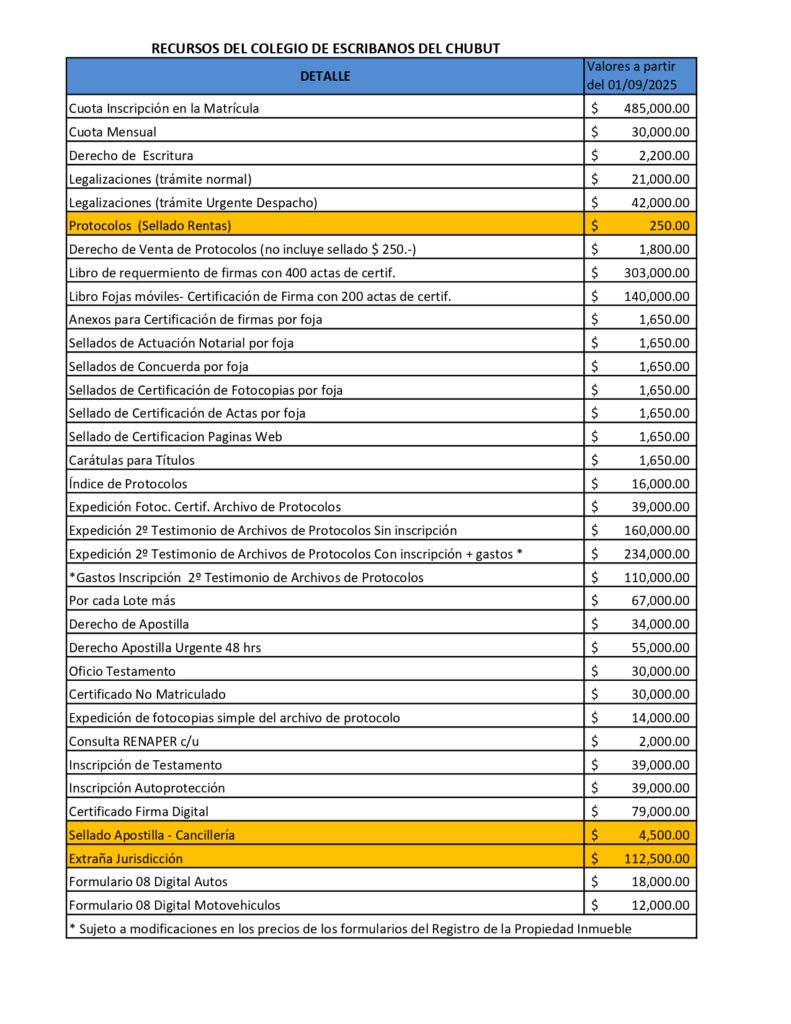 Compartimos para su conocimiento, los nuevos aranceles que regirán a partir del día Lunes 1 de Septiembre del corriente año.